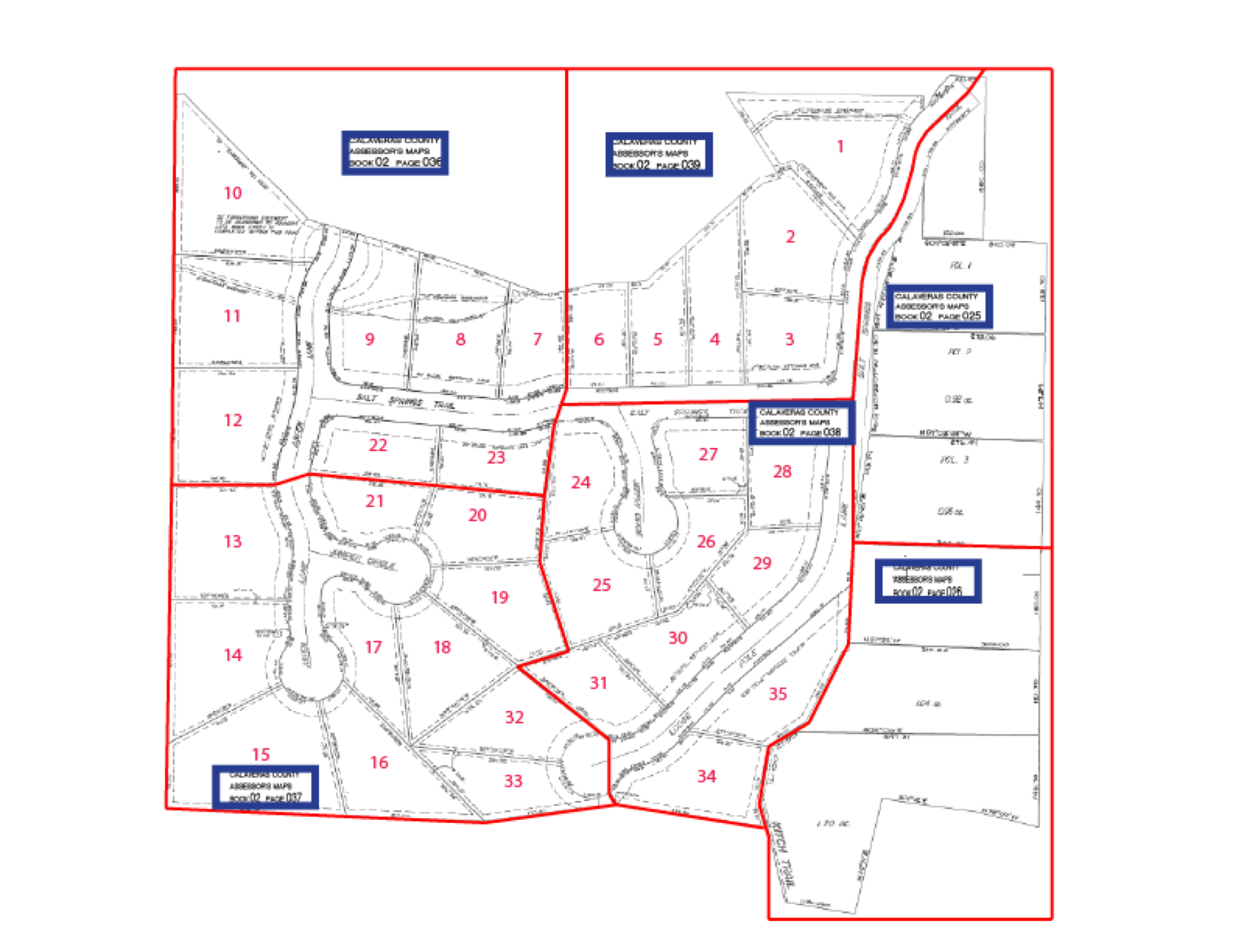 Calaveras County has made electronic copies of the Assessor’s Maps available, reproduced here for convenience. The map above was assembled from these with positions of adjoining parcels approximated. Click on an outlined sector to download the original map.